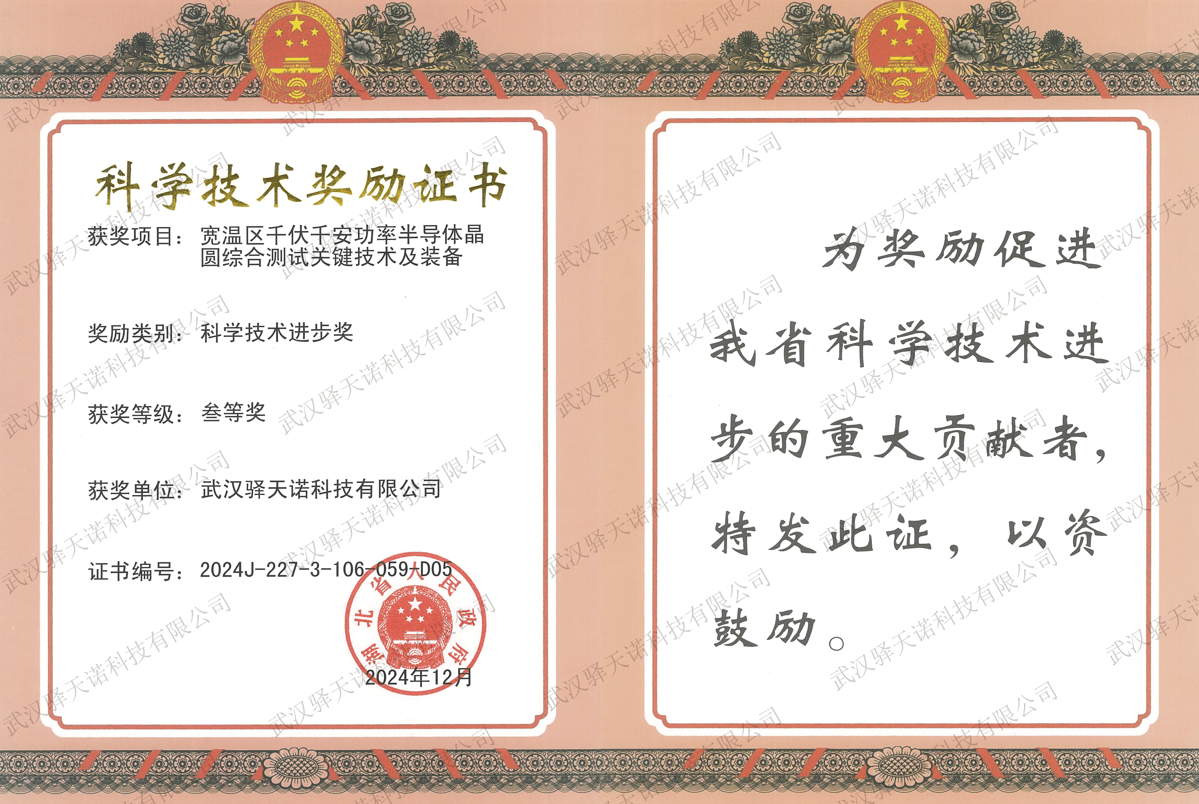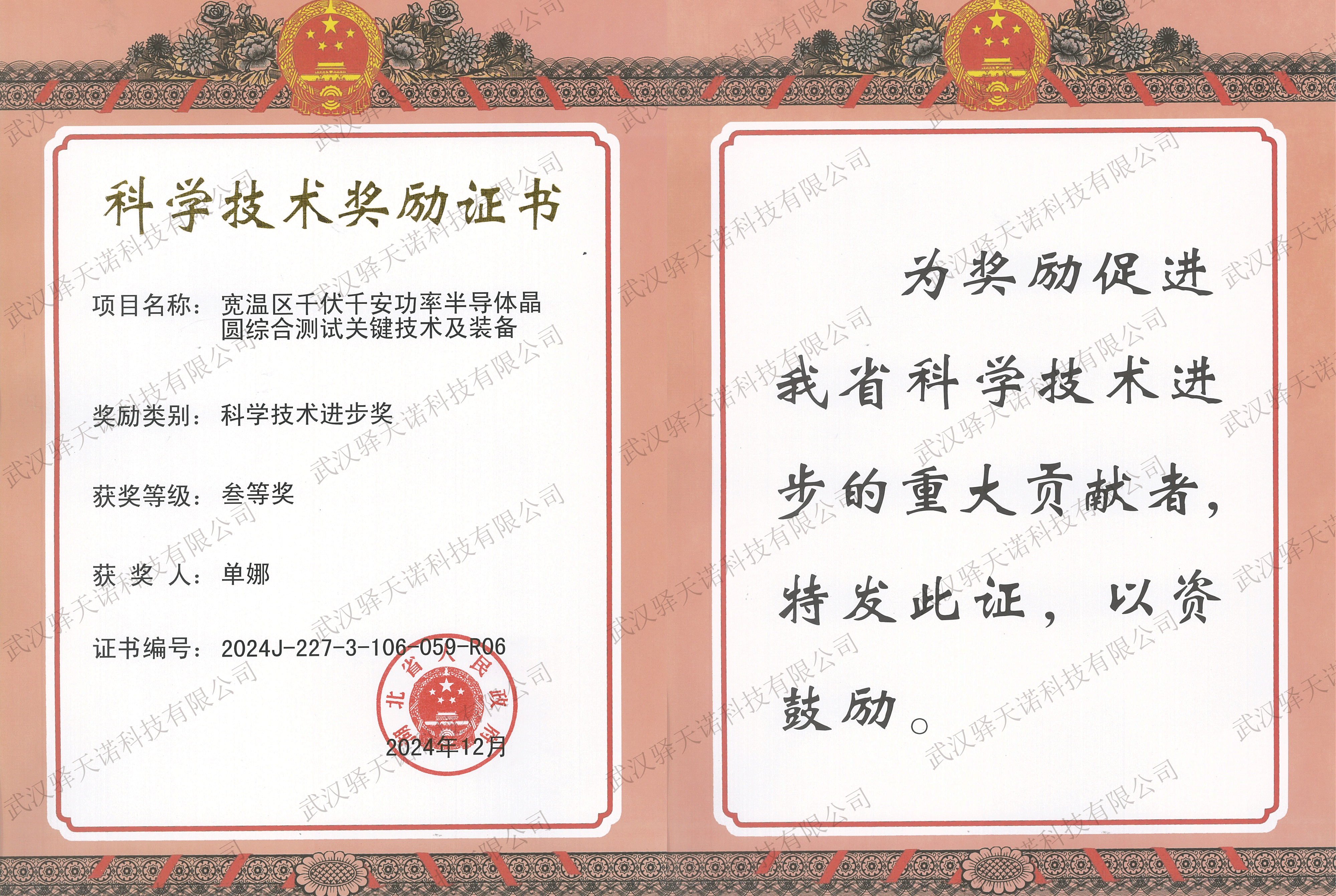 近日,《省人民政府關於(yú)2024年度湖北省科學技術獎(jiǎng)勵的決定》公告顯示——經省科學技(jì)術獎勵評審委員會(huì)評審、省(shěng)科學(xué)技(jì)術獎勵委員會審議,省人民政府決(jué)定,對為湖(hú)北省科學技(jì)術進步、經濟社會發(fā)展作出突出(chū)貢獻的科學技術人員和組織(zhī)給予獎勵。17.c18起草视频(nuò)參與的“寬溫區千伏千安功率半導體晶圓(yuán)綜合測(cè)試關鍵技術及(jí)裝備”項目榮獲湖北(běi)省科學技術進步(bù)獎,董(dǒng)事長單娜個人被評為(wéi)“省科技進步重大貢獻者”。